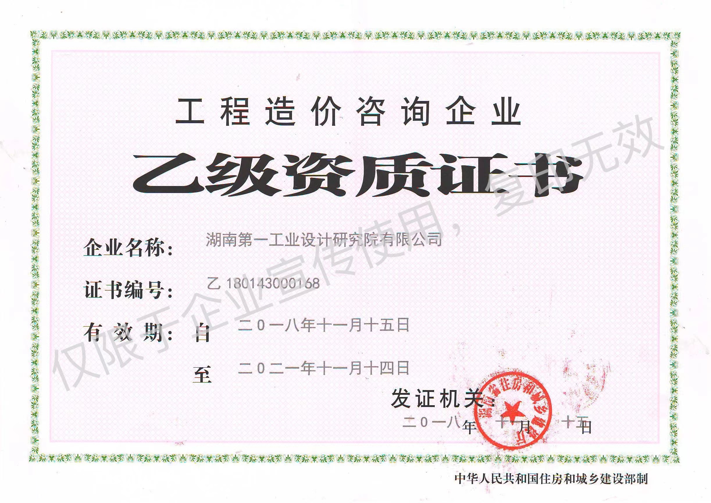 工程造價(jià)咨詢企業(yè)乙級(jí)資質(zhì)證書(shū)