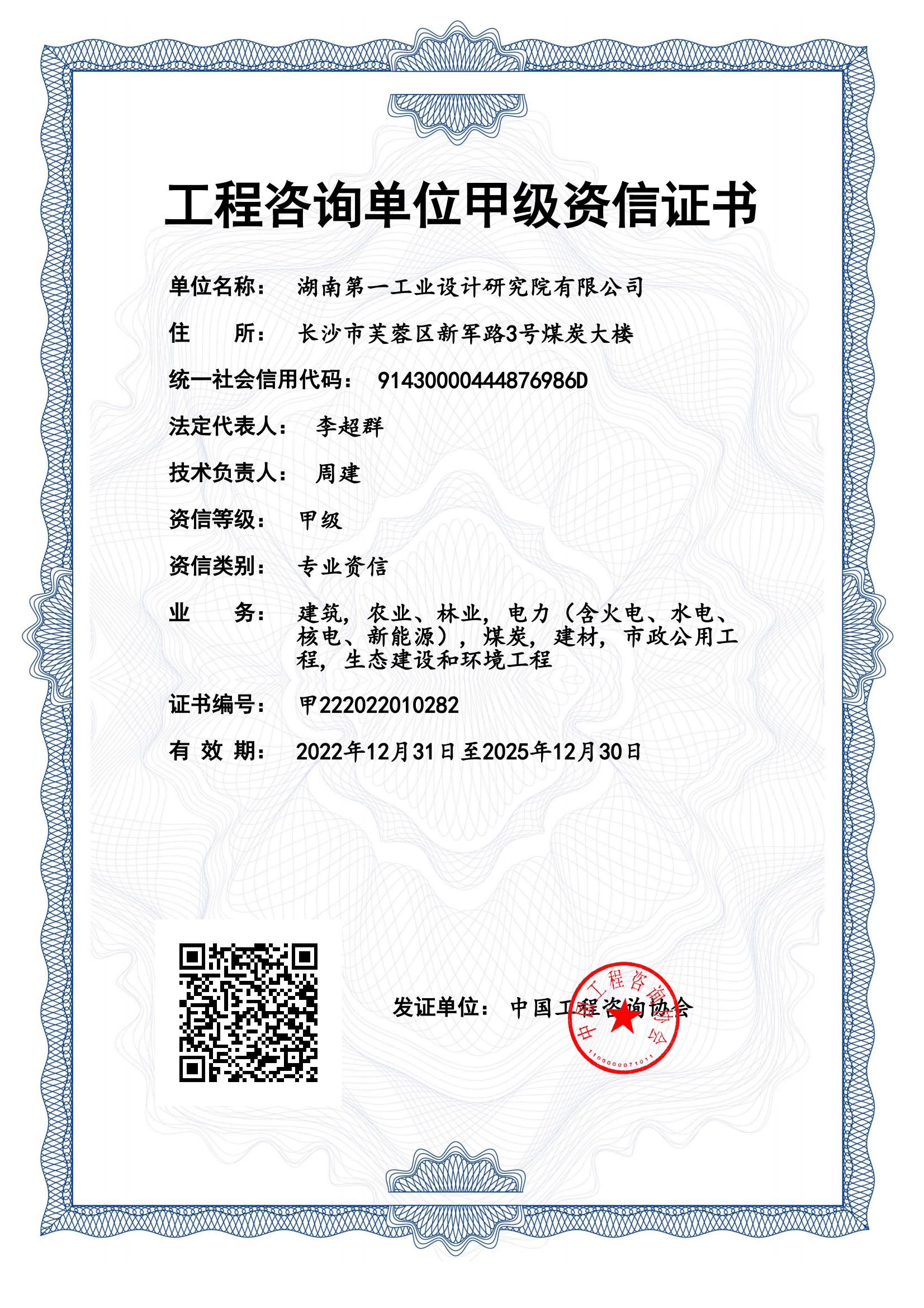 工程咨詢單位甲級(jí)資信證書(shū)